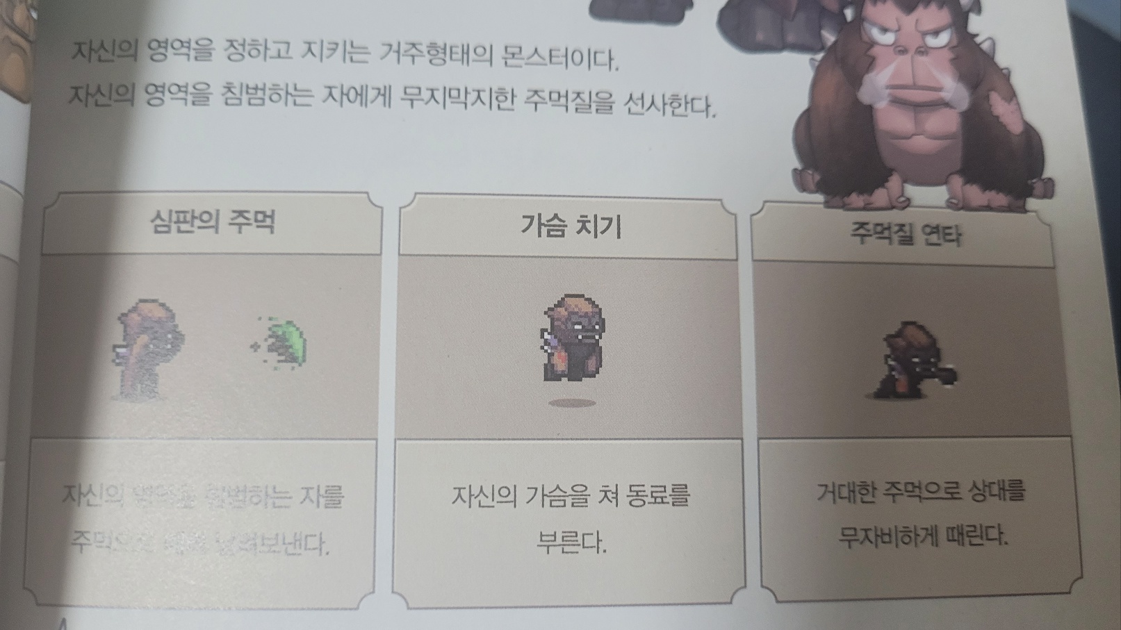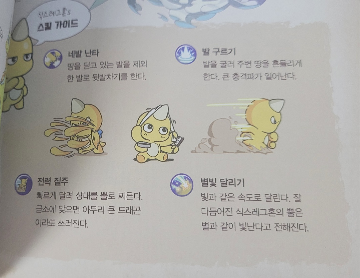 탐험지역 챕터에서는 게임속 탐험지역들이 나오고 그 지역에서 어떠한 드래곤의 알을 얻을 수 있는지 등의 정보들이 있다. 참 신기하고 흥미로웠던 부분은 아직 업데이트 이전인건지 탐험 지역에서 출몰하는 몬스터들과 마치 게임 속 도트 모습과 함께 몬스터의 스킬이 나오는 정보들이 제공되었다. 업데이트 된다면 너무나도 재밌을거 같다!!