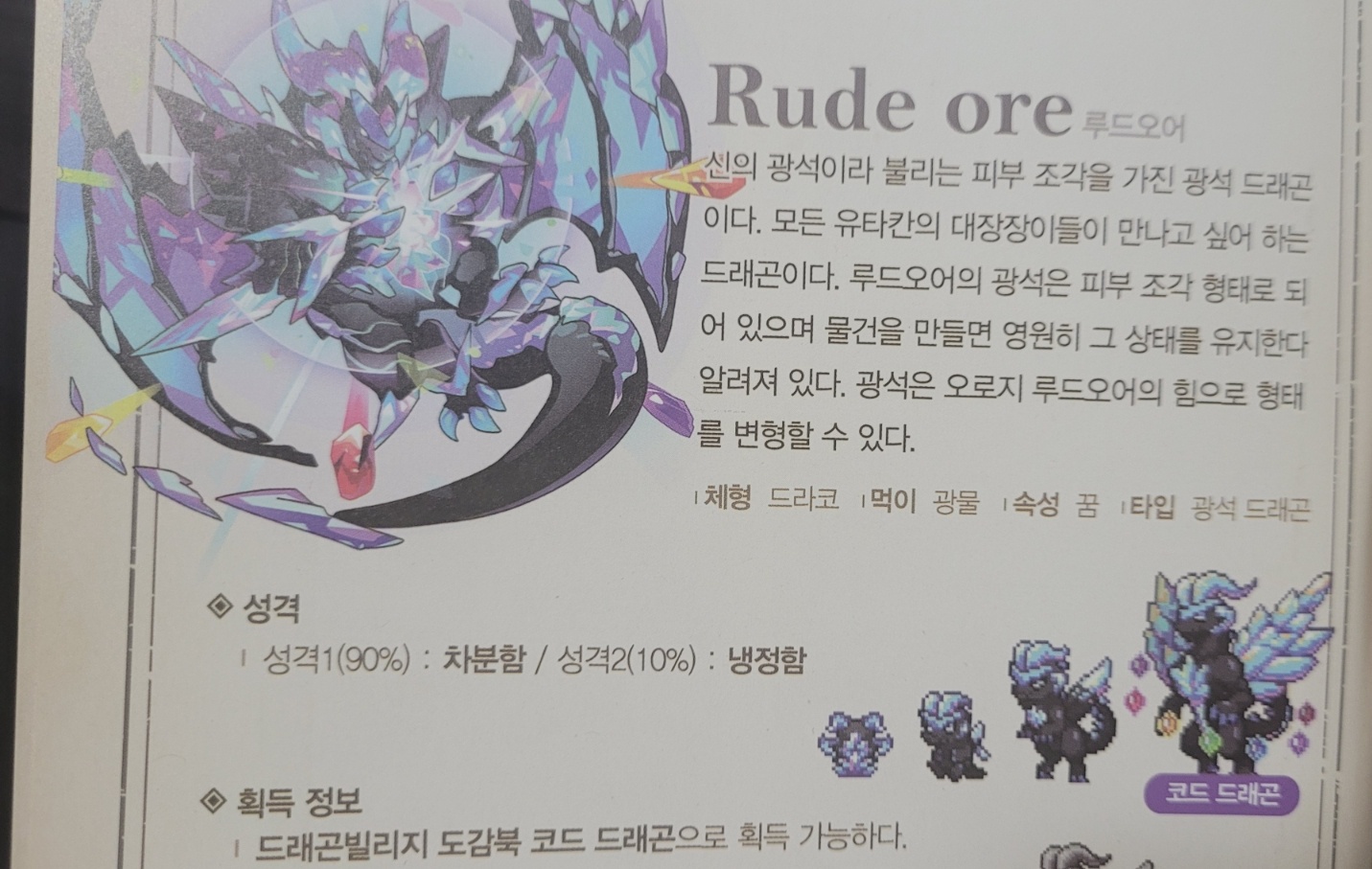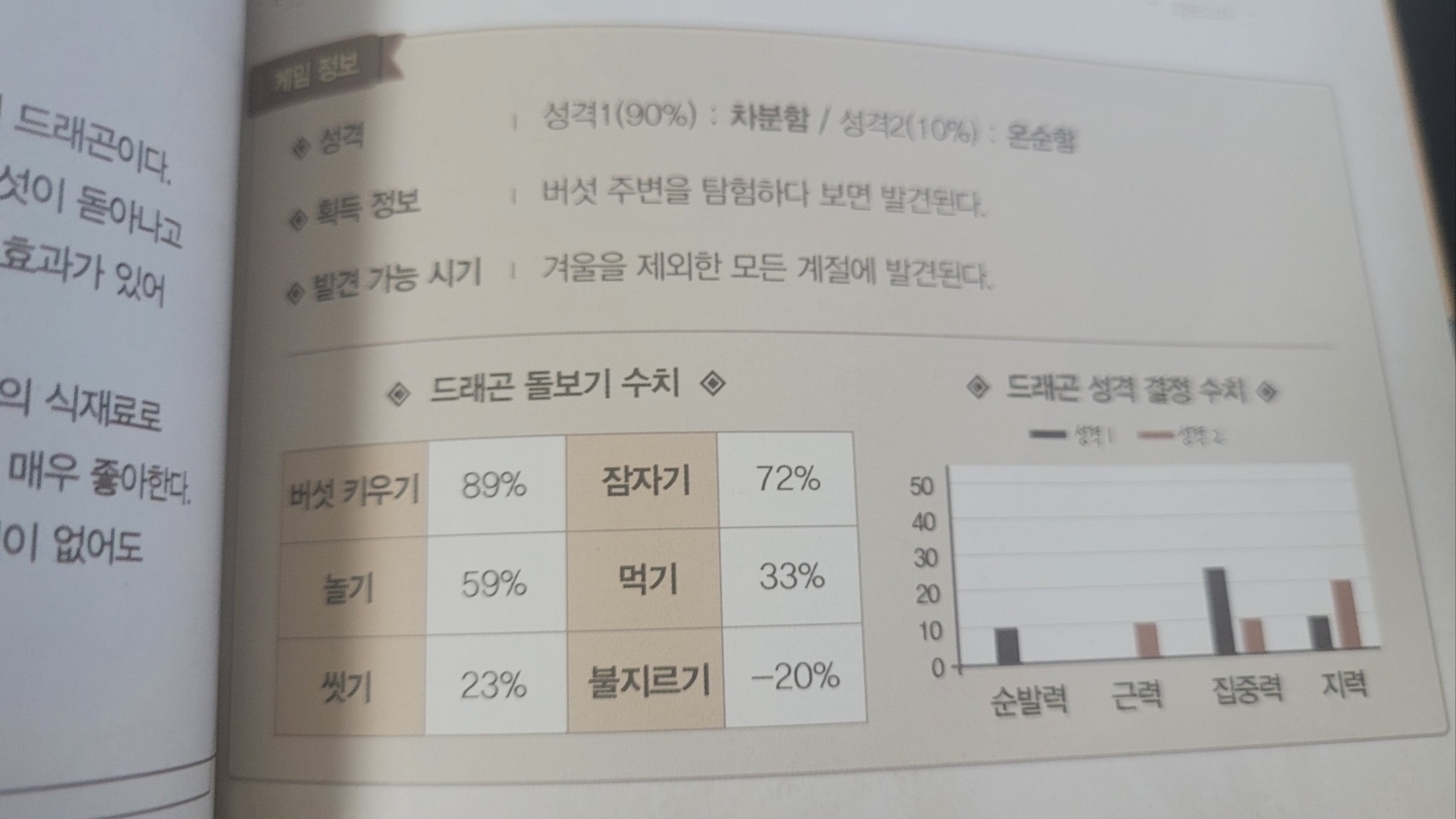 도감북에는 드래곤들의 각각 돌보기 수치와 성격, 획득 정보에 대해서도 나온다. 오오... 뭔가 가장 흥미로운건 요즘 유능한 성격과 각종 오라들에 꽂혀있는 저에게는 초기 개체값들이 나온다는게 신기했다. 최근 흑룡으로 연구한 유능한 성격과 성격작 방법에 대해 올렸던 글이 좀 더 탄탄해질수 있을듯하다.