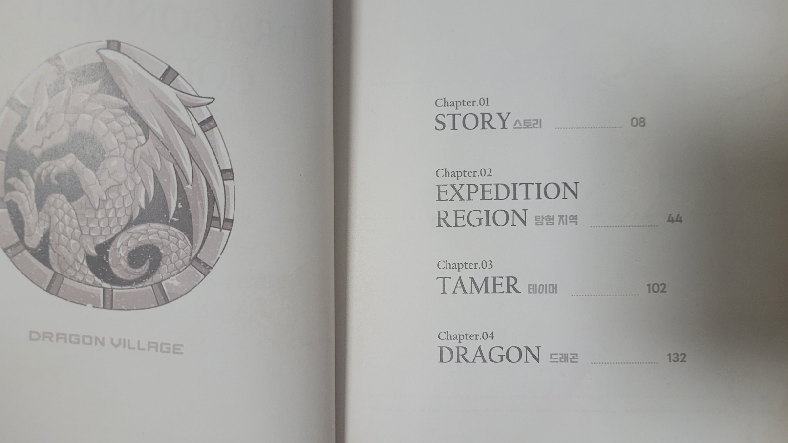 위에서 언급했던 판매처에서 판매하는 정보와 딱~~~ 동일하게 스토리, 탐험 지역, 테이머, 드래곤 4가지의 목차였다. 전체 페이지가 512P이므로 사실 Chapter.03까지는 25%정도에 해당하는 페이지고 대부분 역시 가장 흥미로운 드래곤빌리지 드래곤들의 도감 내용이다.
