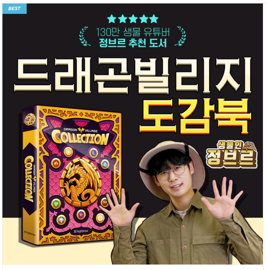 드래곤빌리지 컬렉션 게임에 맞춰 발간하게 된 도감북이다. 130만 생물 유투버인 정브르님께서 홍보대사인가보다.(누군지 모르지만...ㅎ) 책은 네이버 스마트 스토어에서 인터넷 주문을 하였다. 책을 판매하는 곳에서의 책에 대한 소개는 드래곤빌리지의 세계를 완전정복한다며 소개하고 책에 대한 정보들은 아래와 같이